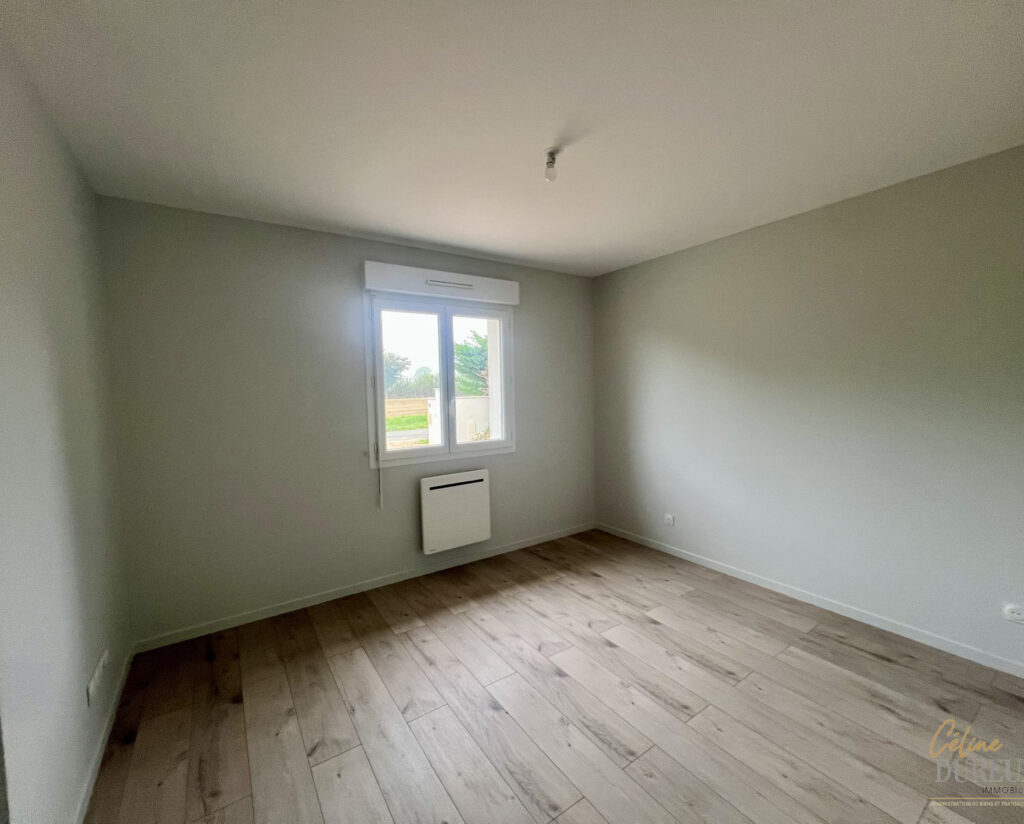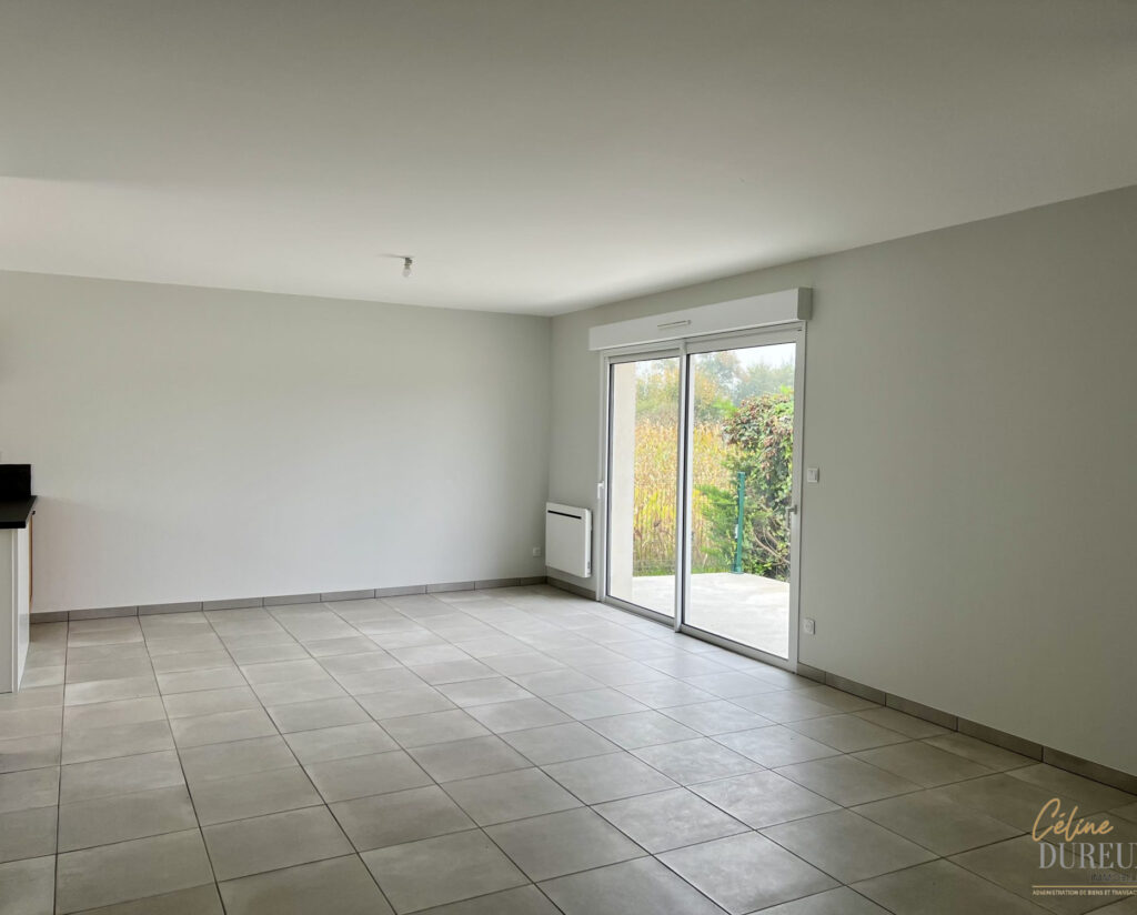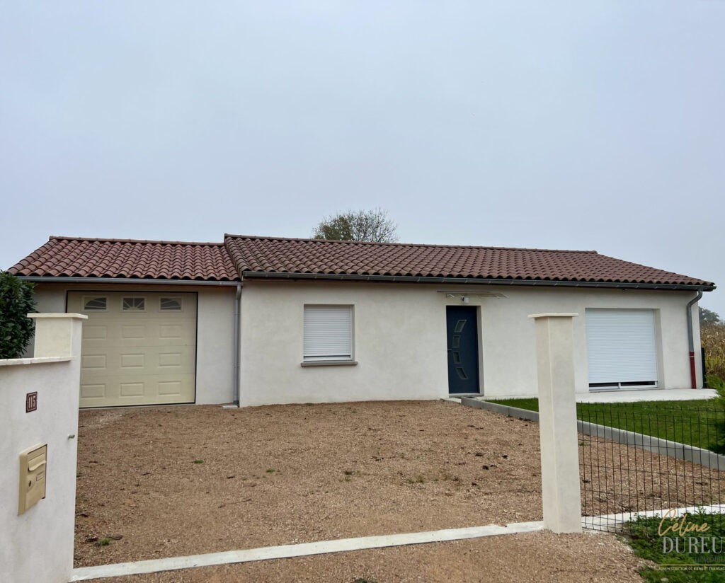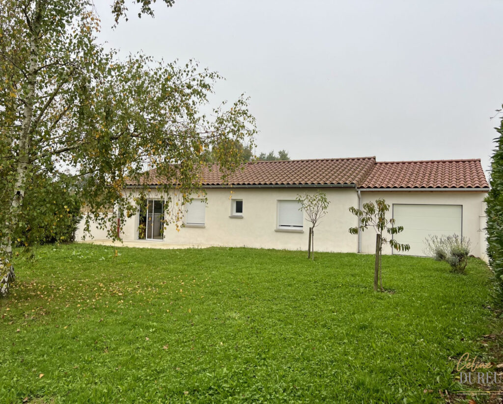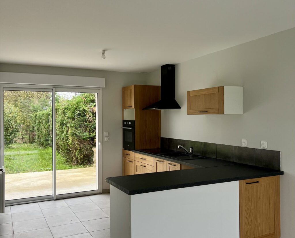 Entièrement de plain pied, la maison comprend : un séjour ouvert sur une cuisine meublée, trois chambres avec placards muraux, une salle d’eau avec wc séparés et un garage.