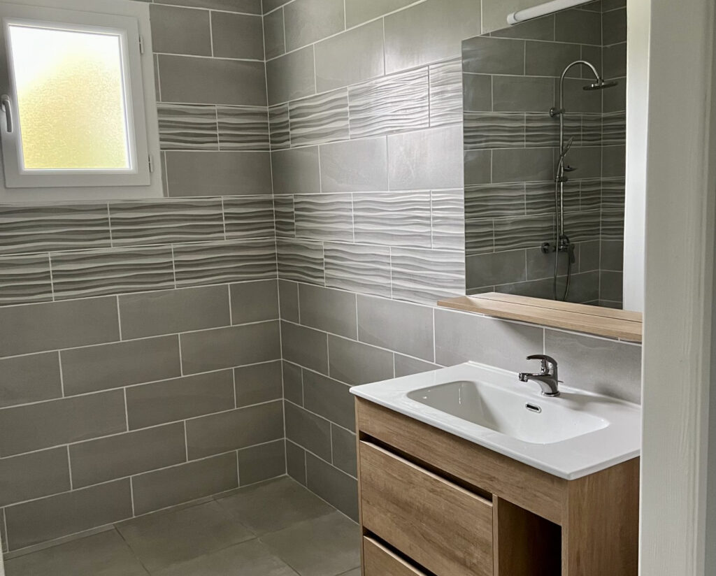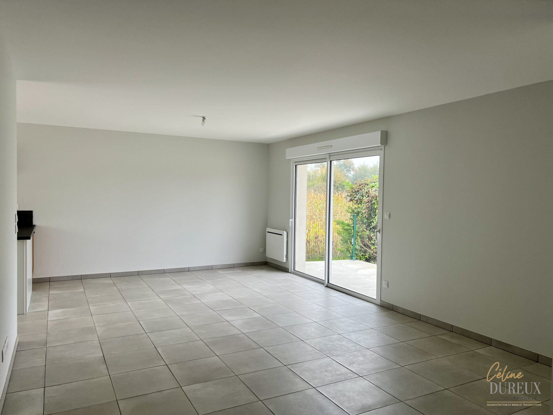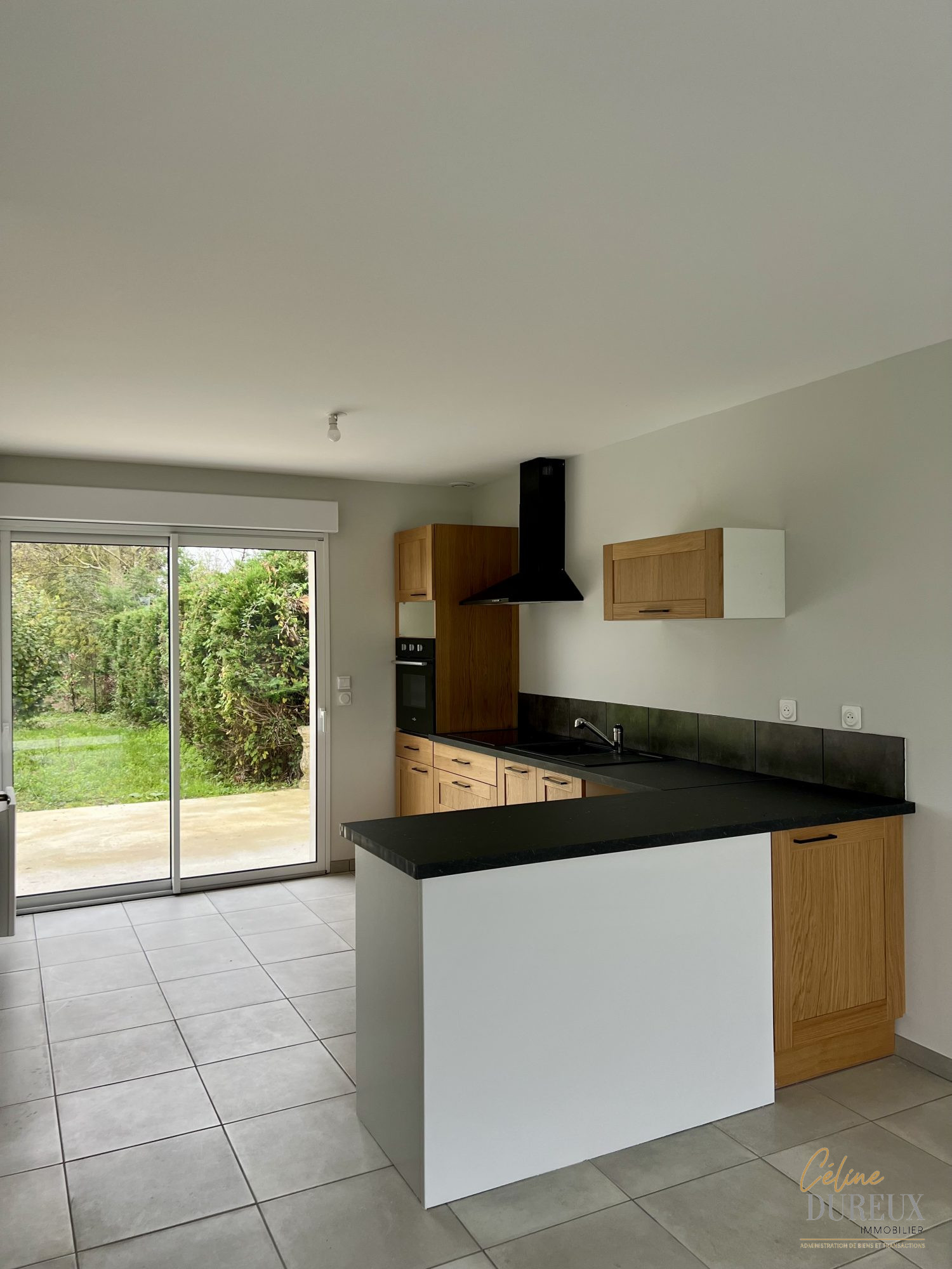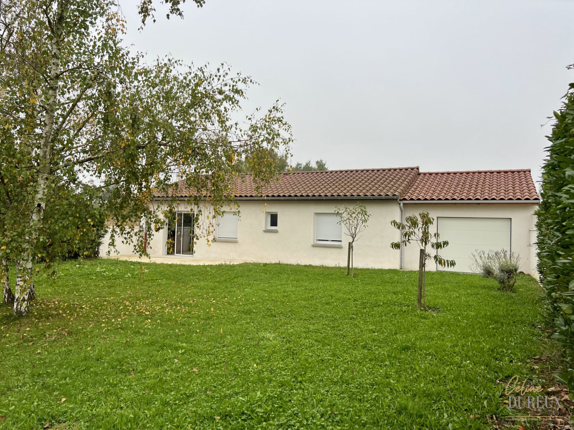 Entièrement de plain pied, la maison comprend : un séjour ouvert sur une cuisine meublée, trois chambres avec placards muraux, une salle d’eau avec wc séparés et un garage.