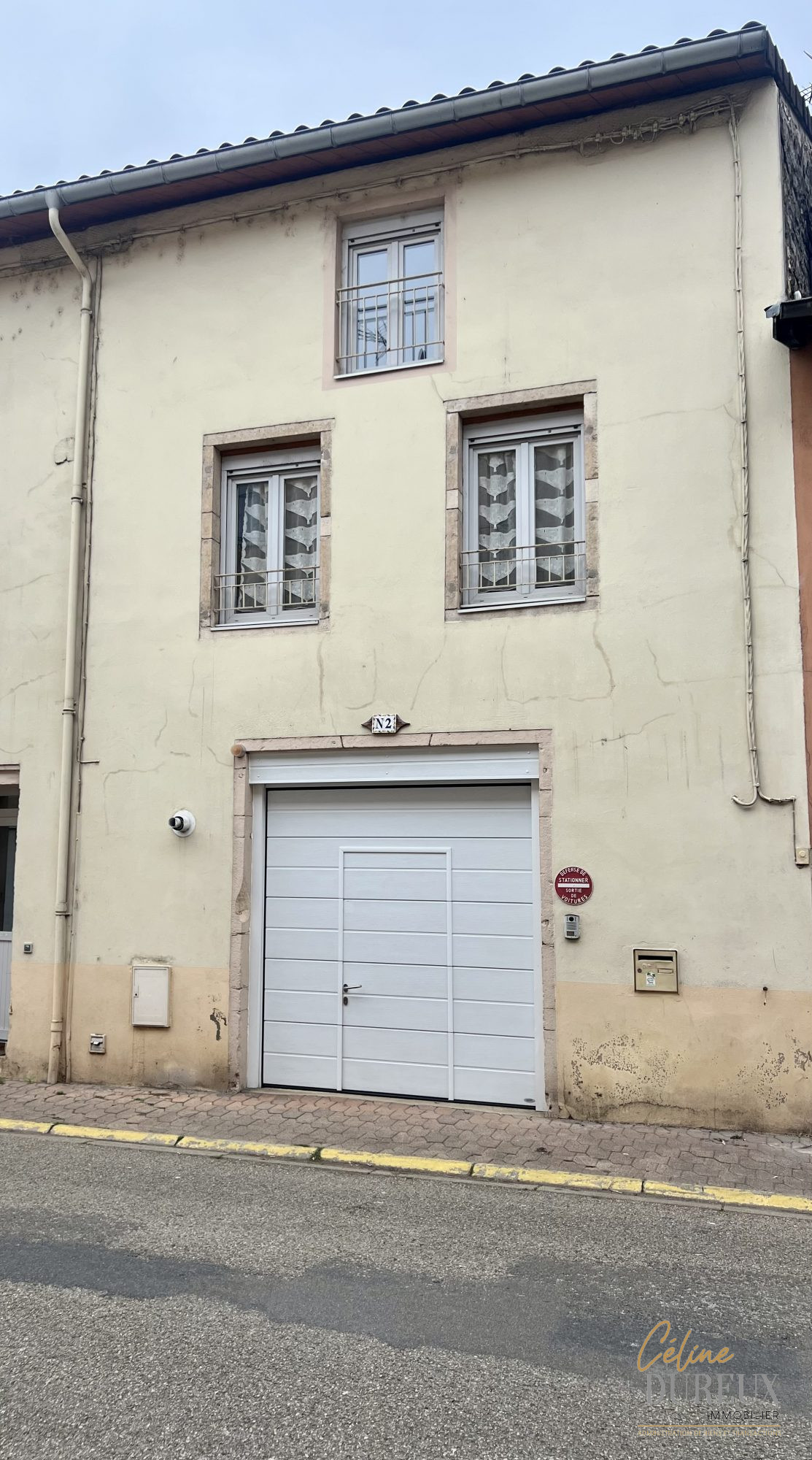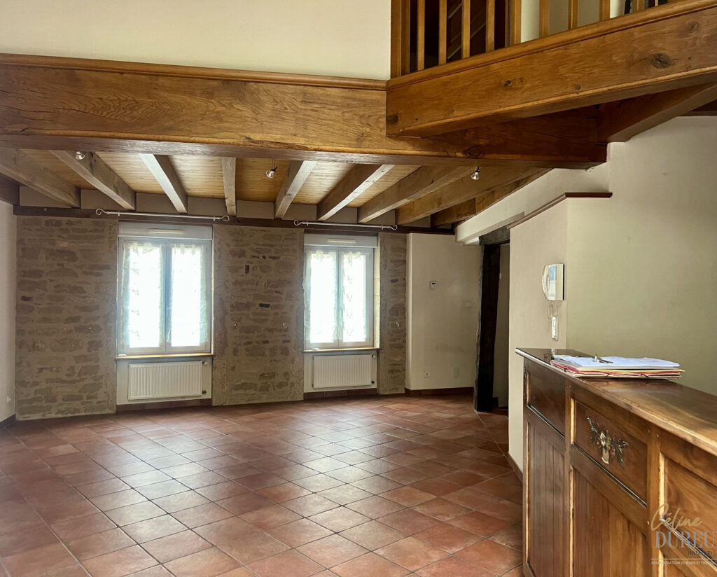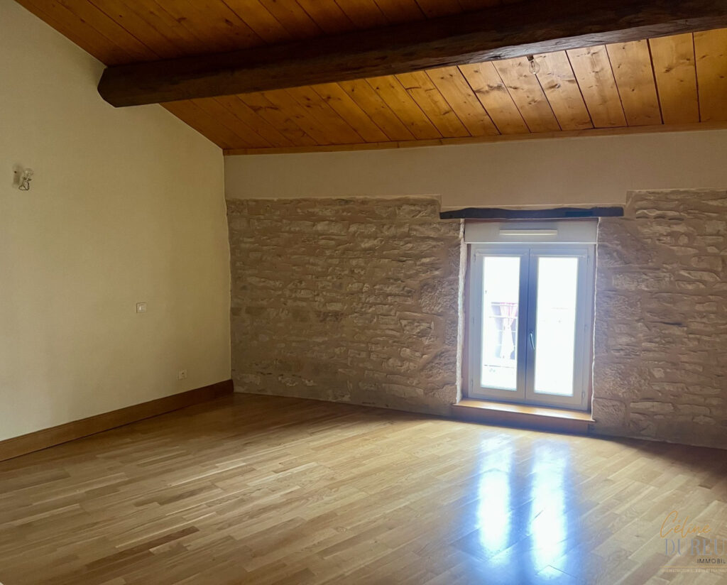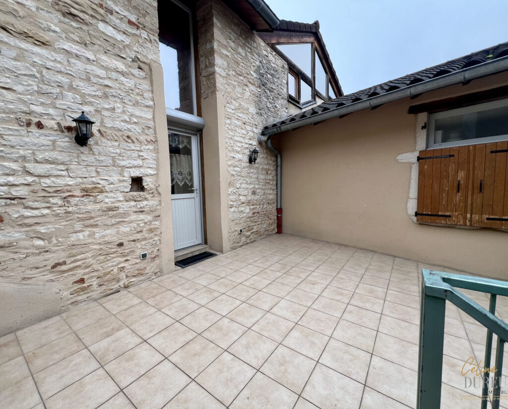 Rue Franche à PONT DE VAUX, belle maison de ville sur trois niveaux composée au rez-de-chaussée d’un grand garage, d’une buanderie et d’une cour intérieure; A l’étage d’une terrasse ouvrant sur la maison comprenant vaste séjour ouvert sur cuisine meublée équipée, suite parentale, salle d’eau et wc séparé; Au 2ème étage, deux chambres, un WC et une grande mezzanine pouvant faire office de salon, salle de jeux ou bureau.